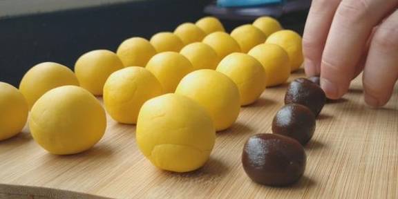 第五步:把南瓜粉团分成大小均匀的小团,准备一点豆沙馅,莲蓉馅也可以,自己喜欢的就OK了,搞成一个一个小团,比南瓜粉团小一点就可以了。