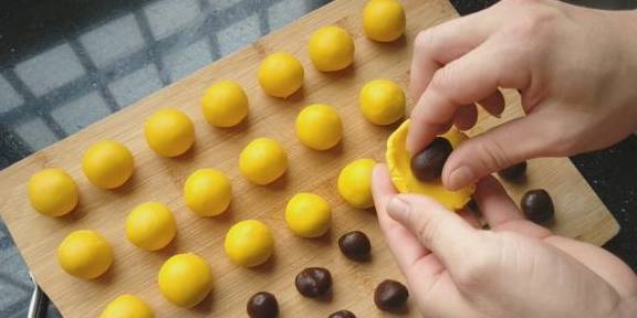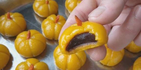第六步:把豆沙馅包进南瓜粉团里(跟包汤圆一样),如果不想包那么多个数,大家可以把粉团与馅料分大一点,就可以少包几个了,节省时间。