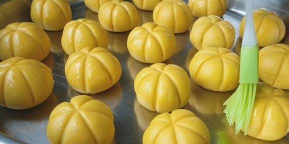 第八步:全部做好后,用个刷子在小南瓜饼上刷一层薄薄的色拉油,这样就可以放到明天早上来蒸了,不用怕它干掉,当然,马上蒸的就不用刷油了。