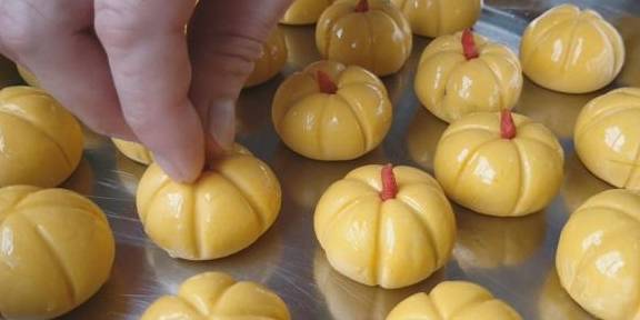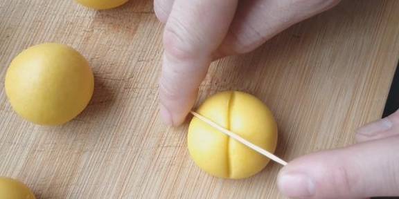 第七步:包好后,用一根牙签把包好的南瓜团搞成南瓜样,要轻一点哦,别把它按扁了。