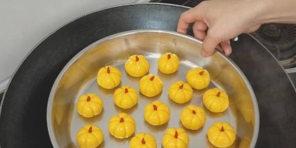 第十步:锅中烧开水,放入一个架子,把做好的小南瓜饼放进去放到架子上,盖上锅盖,蒸10分钟。