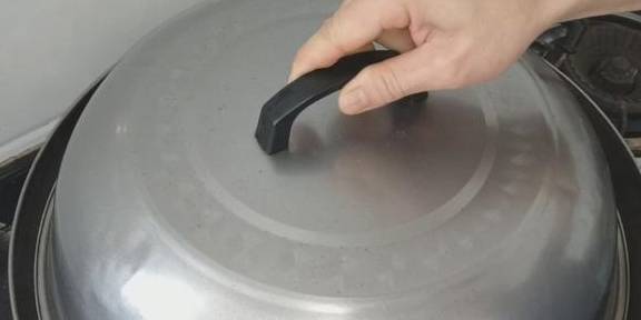 第二步:锅中烧开水,放一个架子,把南瓜端进去放架子上,盖上锅盖,隔水蒸熟,时间大概10分钟吧,看你切的南瓜片厚薄程度而定。