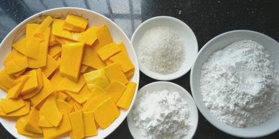 第一步:先来准备必须的食材,大家可以按比例增加减用量,先准备250g的南瓜片,40g的白糖,40g的玉米淀粉,170g的糯米粉。