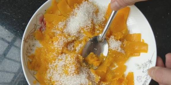 第三步:南瓜蒸好后会有少量的倒流水,我们把它倒掉,然后趁热加入白糖,把它压成南瓜泥。