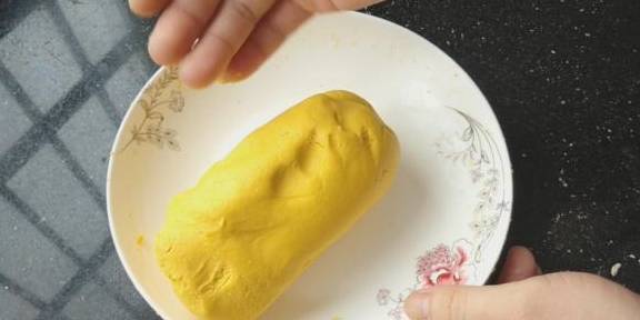 第四步:南瓜搅烂后,加入玉米淀粉,糯米粉,把它稍微搅一下,揉成团,如果太湿可以加多点糯米粉,太干的话加点水,把它揉光滑就可以了,不粘手不粘盘。