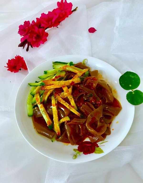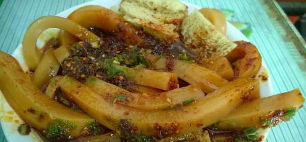 梗皮,没有错,这不是南方粳米做成的粳米皮,而是红薯梗做成的,这是青海人自己的发明,本来只是困难时期,节省大米的一种吃法,结果变成了一道美味的小吃。