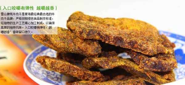 青海以前最有名的牦牛肉干就是雪山牌,小编小时候吃过,因为牦牛的脂肪量低,吃起来非常的弹口,十分筋道,而且回味很久,有吃了一块,再想吃一块的感觉。可惜这个牌子2006年易主他人了,现在的青海牦牛肉干,真假难辨,十分的遗憾!