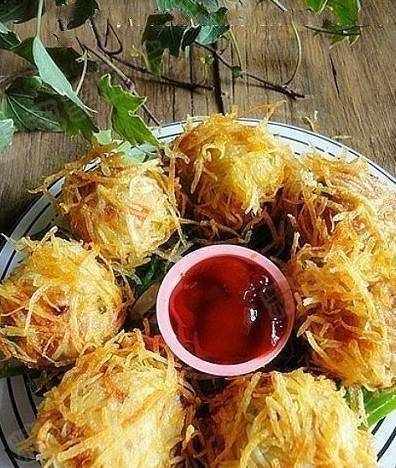 然后再把和好的土豆放进油锅里炸,最好是有一个东西可以让土豆丝定型的,炸出来后就会有了形状。