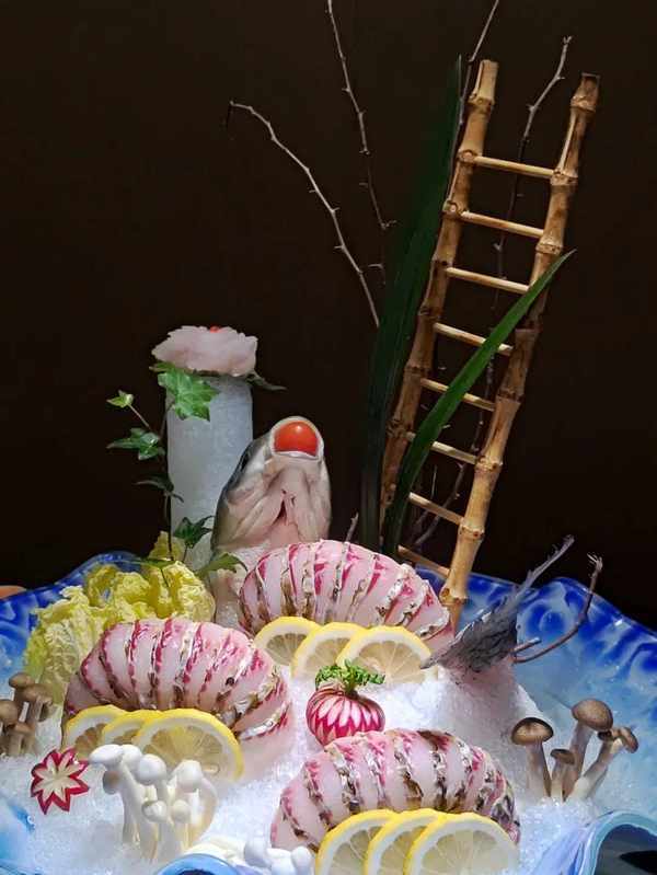 “鲤鱼跳龙门”是隐厨的招牌菜品之一。木兰湖现捞鲜活鱼类,被大厨们切成了薄薄的生鱼片,再一片片放进冰堆中,用萝卜丝、番茄、大白菜、鲜花等作辅助,最终一幅栩栩如生的“鲤鱼跳龙门”作品呈现在作为食客的我们面前,美轮美奂让人不忍下箸。