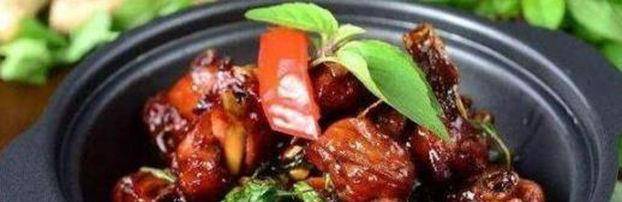 4、往调好糖色的炒锅中参加姜片、蒜碎及腌制好的鸡块进行大火翻炒,待鸡块变成焦糖色时参加三杯料翻炒入味,转中火盖锅盖进行焖煮10分钟左右。焖煮好后开锅加入九层塔持续煸炒收汁。