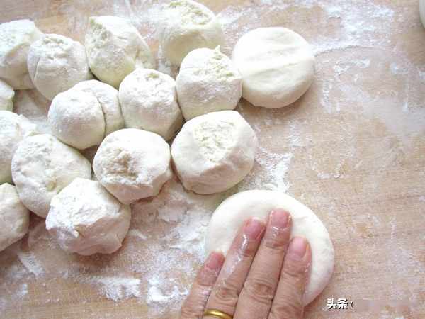 第六步:把發酵好的麵團,拿出揉勻,揪成小劑子,按扁擀成包子皮。