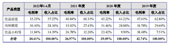 2022年上半年,德馨食品饮品浓浆、风味糖浆、饮品小料三大主营业务毛利率齐降,较2021年分别下降5.61个百分点、2.92个百分点、14.94个百分点。