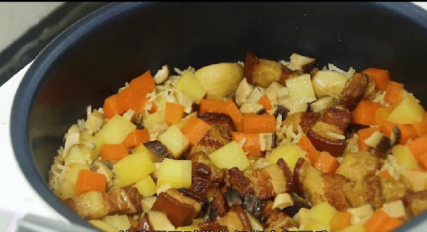 9.大米浸泡后,将水倒掉,只留下大米。之后,将煮好的菜和汤一起倒入电饭锅中,然后按下烹饪按钮进行炖煮。烹饪后,不要急于打开锅。等待五分钟后再打开盖子。打开盖子后,香味浓郁。用勺子搅拌米饭和蔬菜,就可以上桌了。