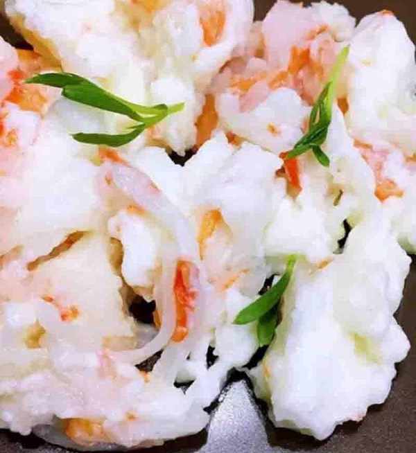 蟹柳用手撕成丝后拌入打好的蛋清液中拌匀