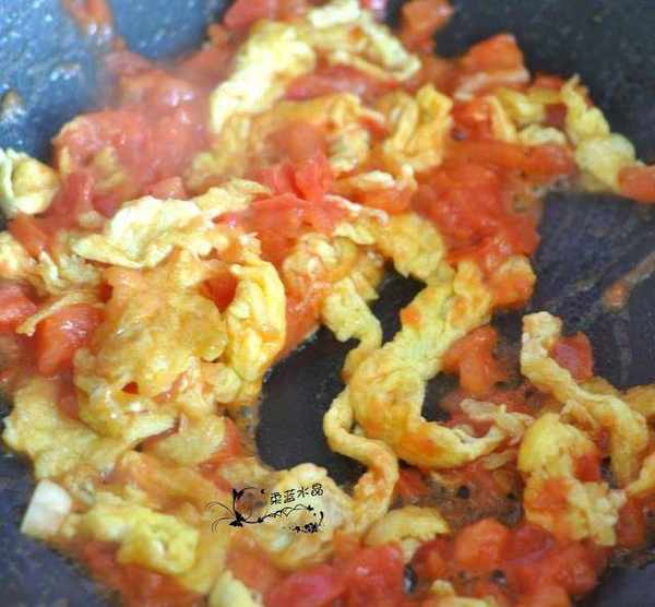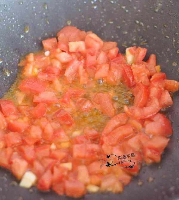 3.锅里再倒一点油,放入蒜粒爆香。放入番茄丁炒软,加一点糖。