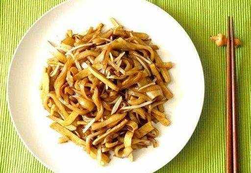 绿豆芽摘去两头,洗净待用,豆干洗净切丝待用,姜洗净切片后切丝待用;锅中下宽油,烧到七成热后放入姜丝炒香,然后放入豆干中火煎至金黄,再放入豆芽、河粉,翻炒均匀后放入老抽、生抽;转小火,一手拿长筷子一手拿铲子帮忙快速翻炒,炒至河粉颜色均匀即可。