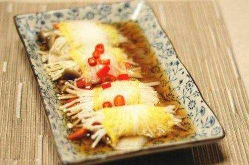 金针菇、蟹味菇切去根部,洗净沥水分成4等份,胡萝卜去皮切丝,红尖椒洗净去籽切成小丁,娃娃菜入沸水锅中烫软后捞出沥水,放入凉水中;用娃娃菜将等量的双菇和胡萝卜丝卷起;生抽、糖、醋、花椒油加上一大匙水混合,倒在菜上,上蒸锅蒸8-10分钟即可。