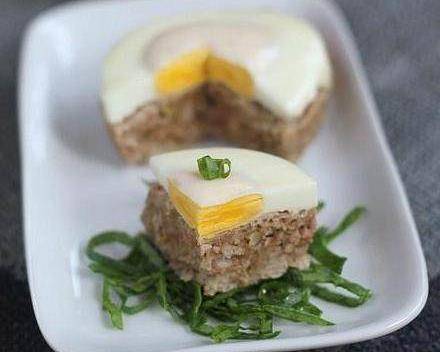 在三分肥七分瘦的肉馅中加入剁的碎碎的葱末倒入适量酱油和料酒调入淀粉和盐,再倒入少许清水搅拌均匀把搅好的肉馅用小勺在碗里按平在上面放一个生鸡蛋把蛋肉糕的雏形放到已经上汽的蒸锅里,中大火蒸十五分钟