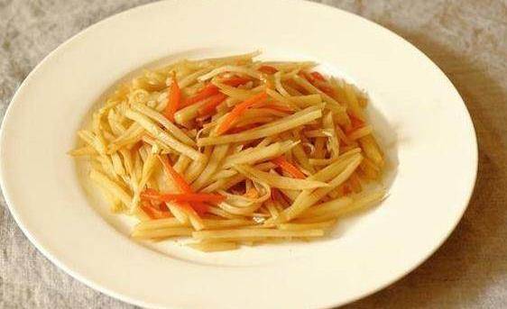 土豆去皮切丝,泡入水中,过两次水漂去淀粉质,然后泡入水中待用,第二次之后泡土豆丝的水就变得比较透明;胡萝卜去皮切丝备用;起油锅放入土豆丝、胡萝卜丝不停中火翻炒,直到土豆丝开始变软(约3-5分钟),然后放入生抽、海盐翻炒均匀,直到土豆颜色透明变软,彻底熟了但还有些脆的时候放入白醋翻炒均匀,关火。