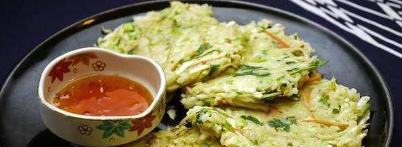 将卷心菜、胡萝卜切丝,金针菇、香菜切段,芹菜切末,蟹肉棒用手撕成丝备用将米饭和切配好的所有材料及调味料(鸡蛋、干淀粉、盐、鸡粉、胡椒粉),放入大盆中拌匀备用热油锅,以汤匙取适量混合的材料,放入锅中边煎边用锅铲整成圆饼状,并煎至两面呈金黄色,即完成。食用时可沾泰式酸甜酱泰式酸甜酱的制作方法:将辣椒酱1大匙、糖2大匙、蒜末1瓣、白醋2大匙、柠檬汁1大匙、蕃茄酱3大匙加入果汁机里,慢速搅拌数下后即可