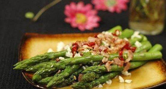 芦笋洗净,去老根备用烧适量清水,加热到水彻底沸腾加4.5滴食用油加入食盐,搅匀把芦笋放入焯水至断生或你喜欢的口感起锅控水后装盘备用在装好盘的芦笋上撒上盐和剁碎的蒜头培根切丁备用热锅上油,油热后下培根炒香。加入煎碎的干红椒,花椒粒小火煸香淋在装好盘的芦笋上,拌匀即可