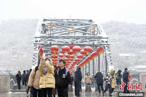 2月13日,甘肃兰州,游客在当地标志性建筑中山桥上自拍打卡。当日,兰州迎降雪天气。 九美旦增 摄
