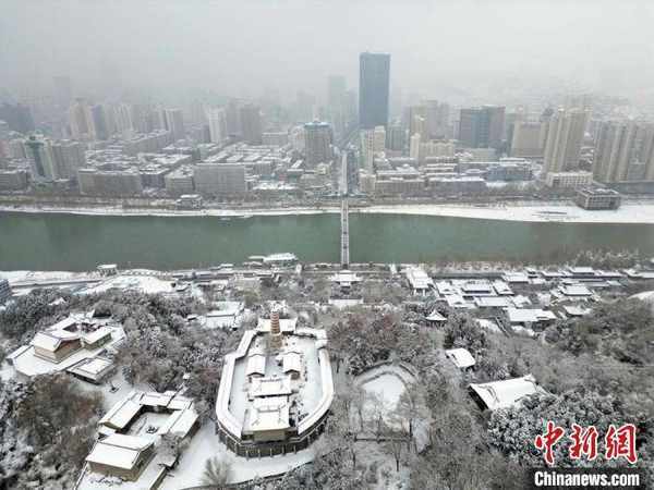 2月13日,甘肃兰州,航拍雪后的黄河兰州段两岸景色。当日,兰州迎来降雪天气。(无人机照片) 九美旦增 摄