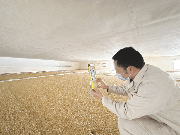 南宁市2022年顺利完成增加1.3万吨储备粮和1100吨应急成品油储备规模。图为五象粮库工作人员在粮仓内用温湿度计监测仓温。记者 覃雨轩 摄