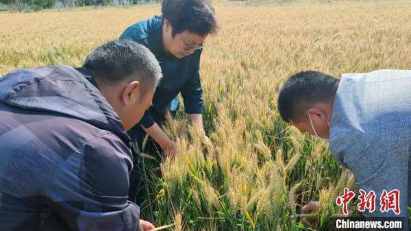 吴兰云(左一)查看麦苗长势情况 吴兰云供图