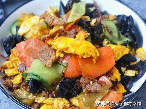 (6)再放入胡萝卜、黑木耳,黄瓜,翻炒至断生,再倒入调好的料汁和炒熟的鸡蛋。