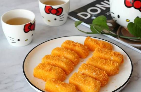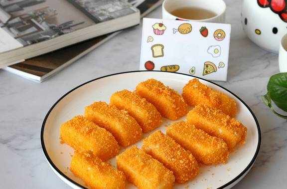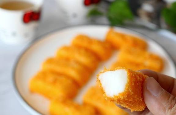 把新鲜的牛奶像是做成奶酱的样子,然后在裹上鸡蛋液还有面包糠,稍微的下锅一炸就可以了,表皮是金黄酥脆的,内里绵软香滑,既可以当成一道菜,也特别适合作饭后甜点,配着茶吃也不错!