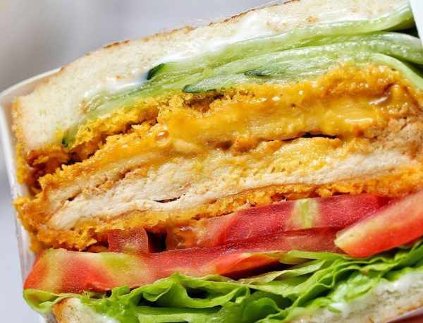 鸡排火腿肉粉松三明治,这个鸡肉火腿肉松三明治真的真的太好吃了,跟便利店里买的根本一个味儿,面包一点都不硬,软乎乎的,里面夹着鸡排、肉松、培根、沙拉酱,带着微微的甜,甜而不腻的口感真的很不错,满满的肉松和沙拉酱,肉松控的一定要买来尝尝,真的太好吃了,咸甜咸甜的口味。饿了的时候直接撕开包装来一个,不用加热的,绝对顶饱,又好吃又方便。