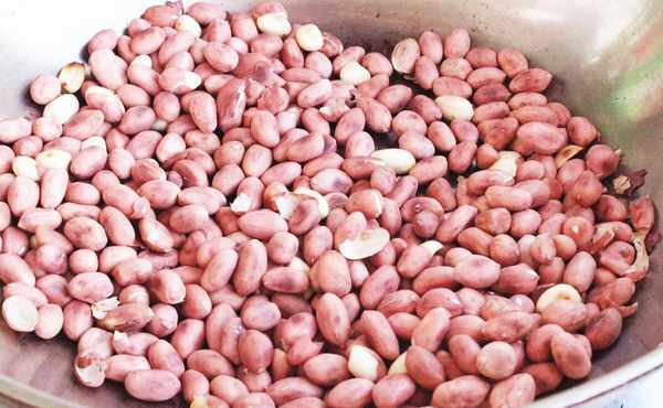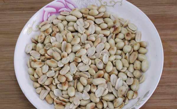 3、炸一段时间后,我们会发现外皮已经快脱落了,然后我们把花生米放在盘子里,等它们冷却下来。如果还有一些外皮没有去掉,我们可以用手把外皮去掉。