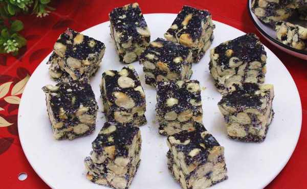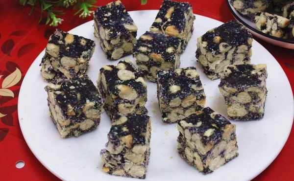 11、我们把花生芝麻糖切成1.5厘米厚的正方形,然后装盘。来看看二姐做的花生芝麻糖的效果吧。感觉还好吗?这种花生芝麻糖咬一口酥脆香甜,比外面卖的好吃。