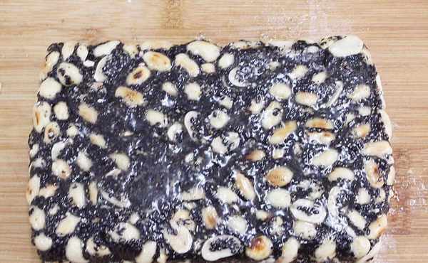 9、做好的花生芝麻糖放在案板上。趁热压出形状比较好,压成长方形。然后我们需要放足够的时间,直到花生芝麻糖完全冷却。.
