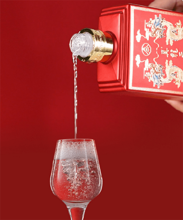 以盛世佳酿致敬盛世中华。真龙天子酒(盛世)通体以正红为主色调,酒盒采用翻盖式手工礼盒包装,酒盒上图案样式借鉴自乾隆年代的皇家御用器盒,两条立体烫金的升龙凸起在酒盒之上,酒盒底部图案名为“海水江崖云龙”图样,有“龙飞在天,福泽天下”的吉祥寓意,酒盒背面是清宫廷画师郎世宁所绘乾隆皇帝在南苑阅兵的戎装图案,以康乾盛世喻当今之盛世。整体瓶身正面为象征吉祥富贵的双龙戏珠图案,双龙均采用升龙造型,图案上方所系龙珠由五粮液商标演化而来,图案中间有这款酒的名称“真龙天子”二字。瓶盖采用官帽造型,寓意官运亨通;瓶口采用金色锁扣包装;瓶身上有三处台阶,预示着步步高升之意;酒瓶底部图案,采用古代帝王常见的龙袍代表深海的水脚和提拔岩石的海水江崖,寓意福山寿海,同时也隐含了“江山一统”和“万世升平”的美好祝愿。