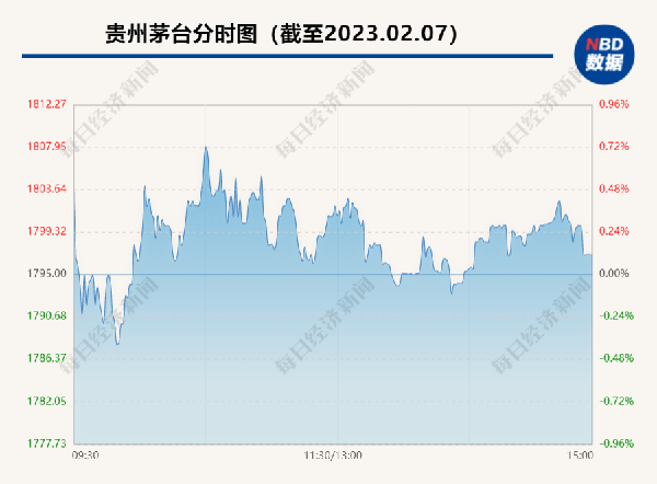 截至7日A股收盘,贵州茅台股价1797元,上涨0.11%,市值2.3万亿元。