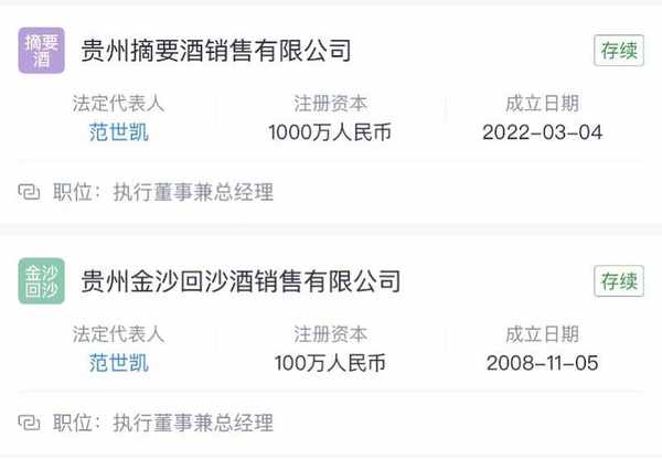 南都湾财社记者注意到,范世凯担任金沙酒业总经理前,他就分别出任贵州摘要酒销售有限公司和贵州金沙回沙酒销售有限公司总经理,这两家公司均由金沙酒业全资控股,为该公司主力产品摘要及金沙回沙酒的销售公司。