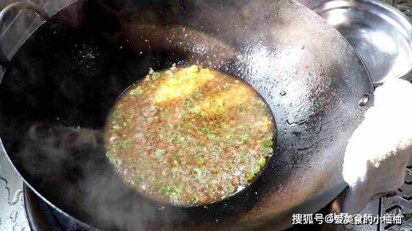 7.锅内再烧油,油烧热以后,倒入葱姜炒出葱香味,把豆腐丁下入锅内,颠锅翻炒至豆腐断生,倒入煮好的汤汁翻匀以后起锅倒出。