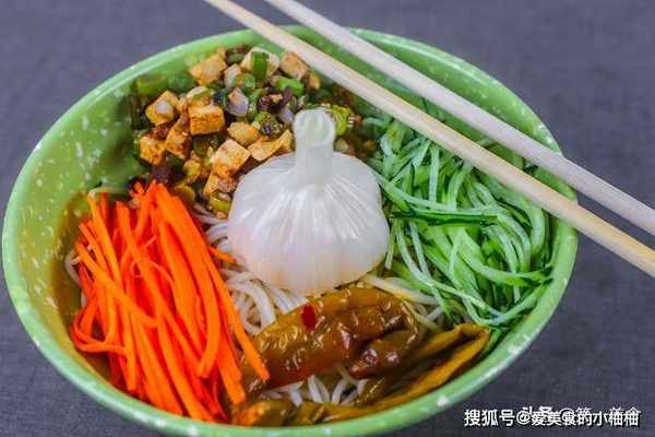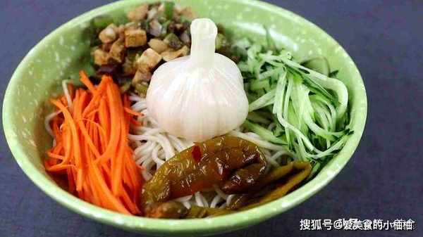 9.把面条捞入碗中,放上黄瓜、胡萝卜丝,浇上煮好的香菇臊子即可,也可以配上自己喜欢吃的咸菜,再来一瓣蒜吃着得劲的狠。
