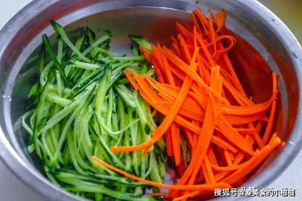 3.洗净的黄瓜一根,先切薄片再切细丝,胡萝卜半根也切成细丝,黄瓜和胡萝卜是直接食用的,注意生熟案的分离。