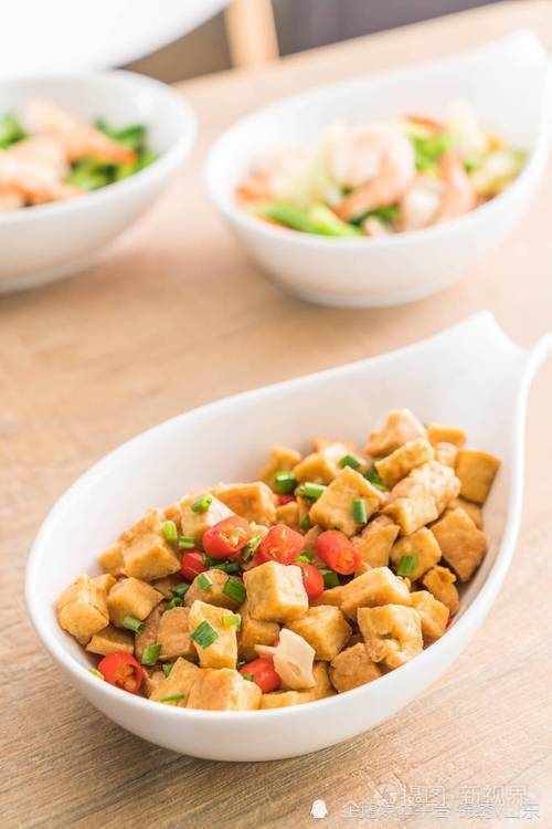 4.另起锅下油,放入元贝和红椒,把炸过的豆腐放入,再勾芡,把炸过的腰果放入,拌匀即可起锅装盘