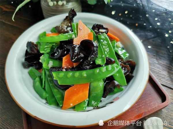 原料:荷兰豆、木耳、山药(也可用马蹄)、红椒
