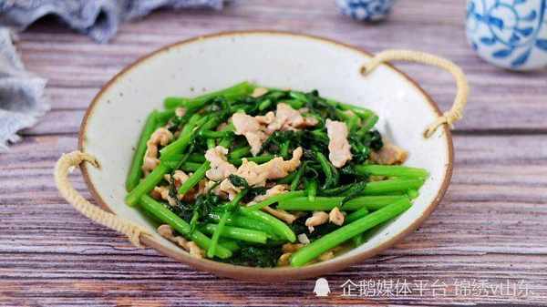 食材:茼蒿一把、猪瘦肉1块、蒜粒6个、盐半勺、生抽1勺、料酒半勺。