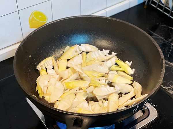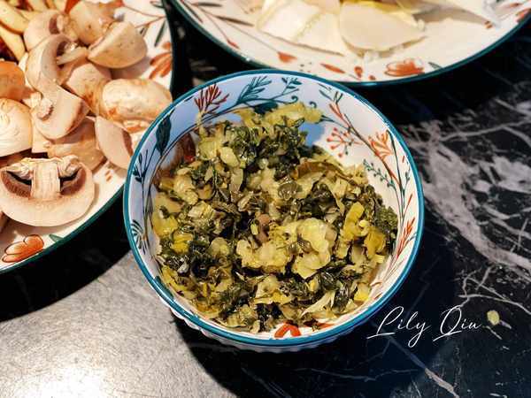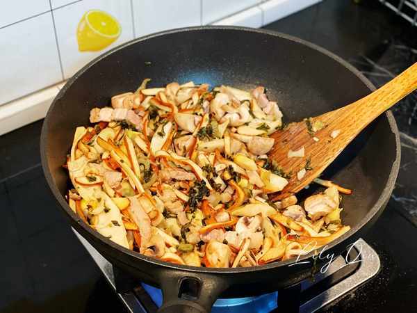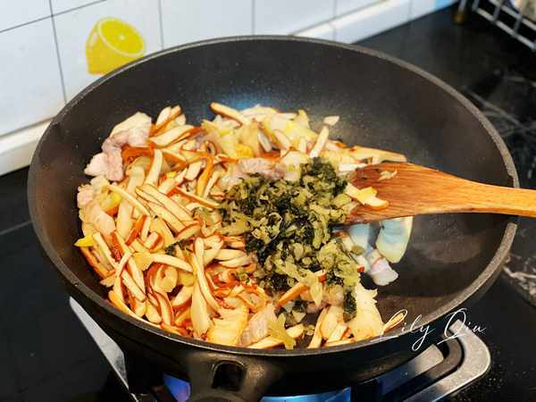 依次加入肉片、香干、雪菜、蘑菇翻炒;