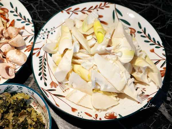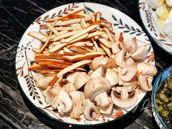 香干切丝,蘑菇切小块,正巧盒马刚送货到家,顺手又取了一块五花肉,去皮,切了些膘油和肉片备用;
