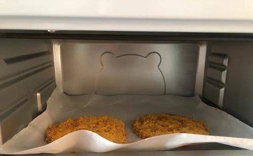 第四步:肉饼依次裹上淀粉,鸡蛋液,面包糠,然后刷上少量油放入烤箱,烤箱温度上下180度,烤上40分钟左右。在烤肉饼的同时,用锅将汉堡胚进行加热解冻。