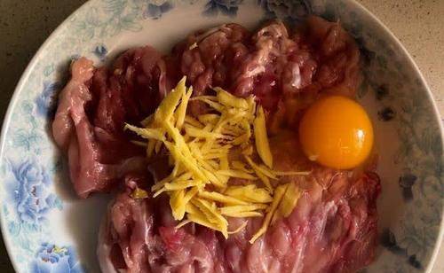 第二步:鸡腿里放入姜丝,一个鸡蛋,一勺料酒,一勺生抽,一勺蚝油,一勺孜然粉,一勺辣椒面,少量盐腌制半个小时。