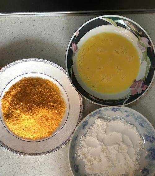 第一步:先把鸡腿去骨,再用刀背拍打鸡腿肉,接下来生姜切丝,然后准备淀粉,面包糠,再把鸡蛋液打好。