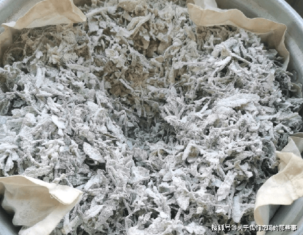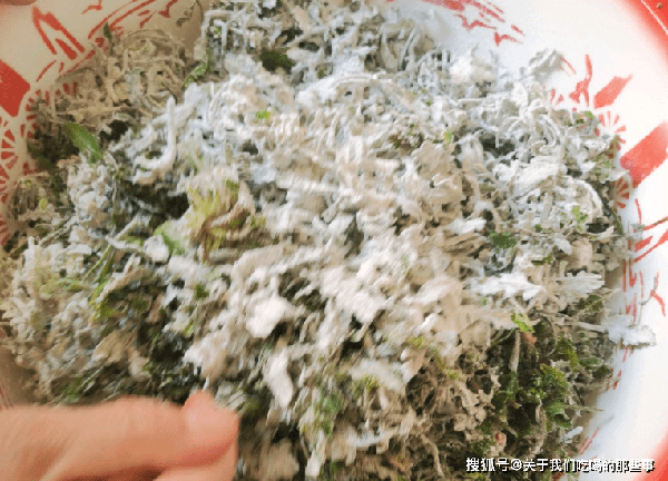 1、荠菜洗干净,沥干水分,表面没有明显的水珠即可。把荠菜切成小段,放入盆中,加入一勺干面粉,用手抓拌均匀,表面裹上一层干粉。